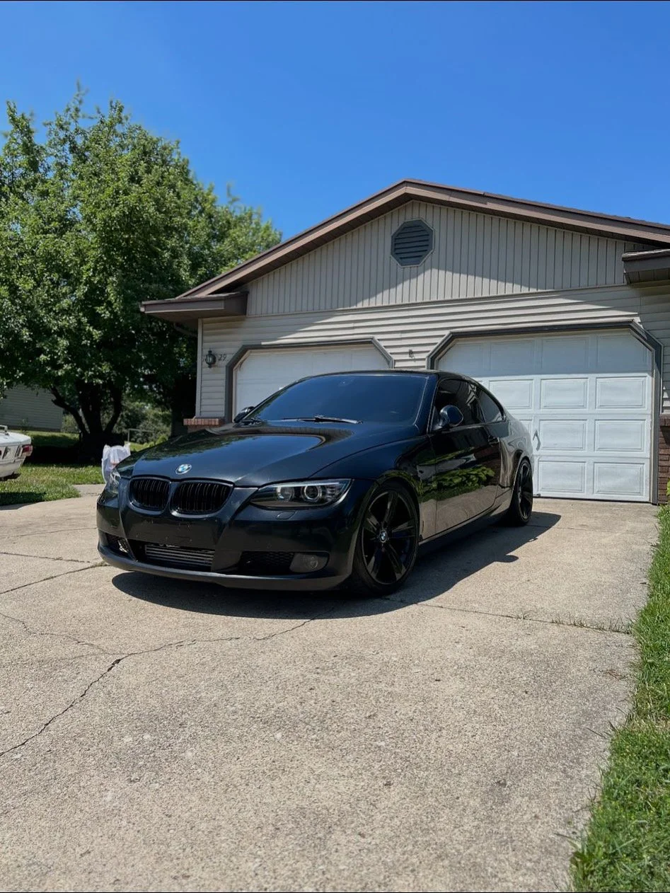 A black BMW coupe parked in front of a garage on a concrete driveway, with a house, a tree, and a blue sky in the background.