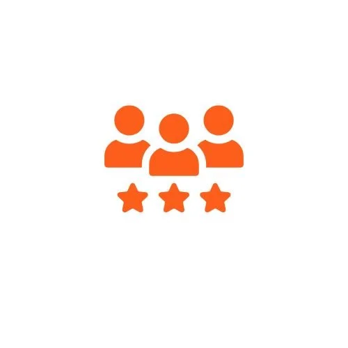 Icon of three people with three stars below them, symbolizing team or customer ratings.
