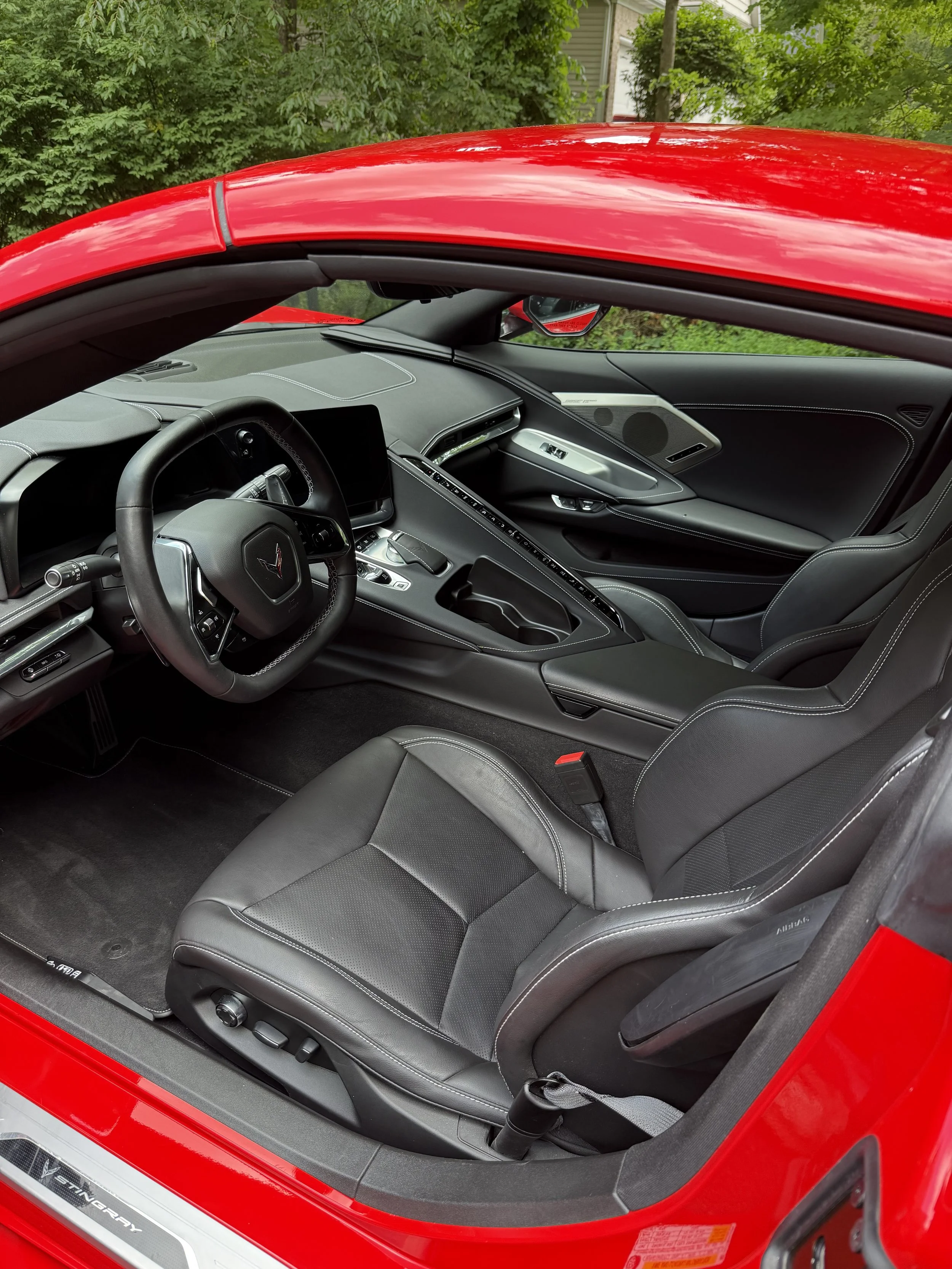 Interior of a red sports car showing a black leather driver's seat, steering wheel, center console, and dashboard with a digital display.