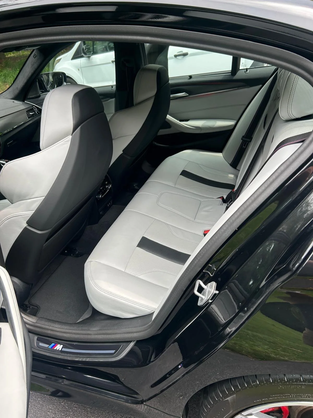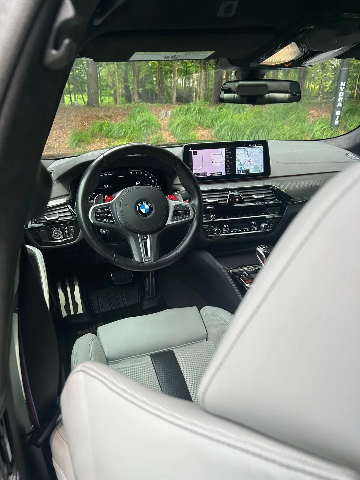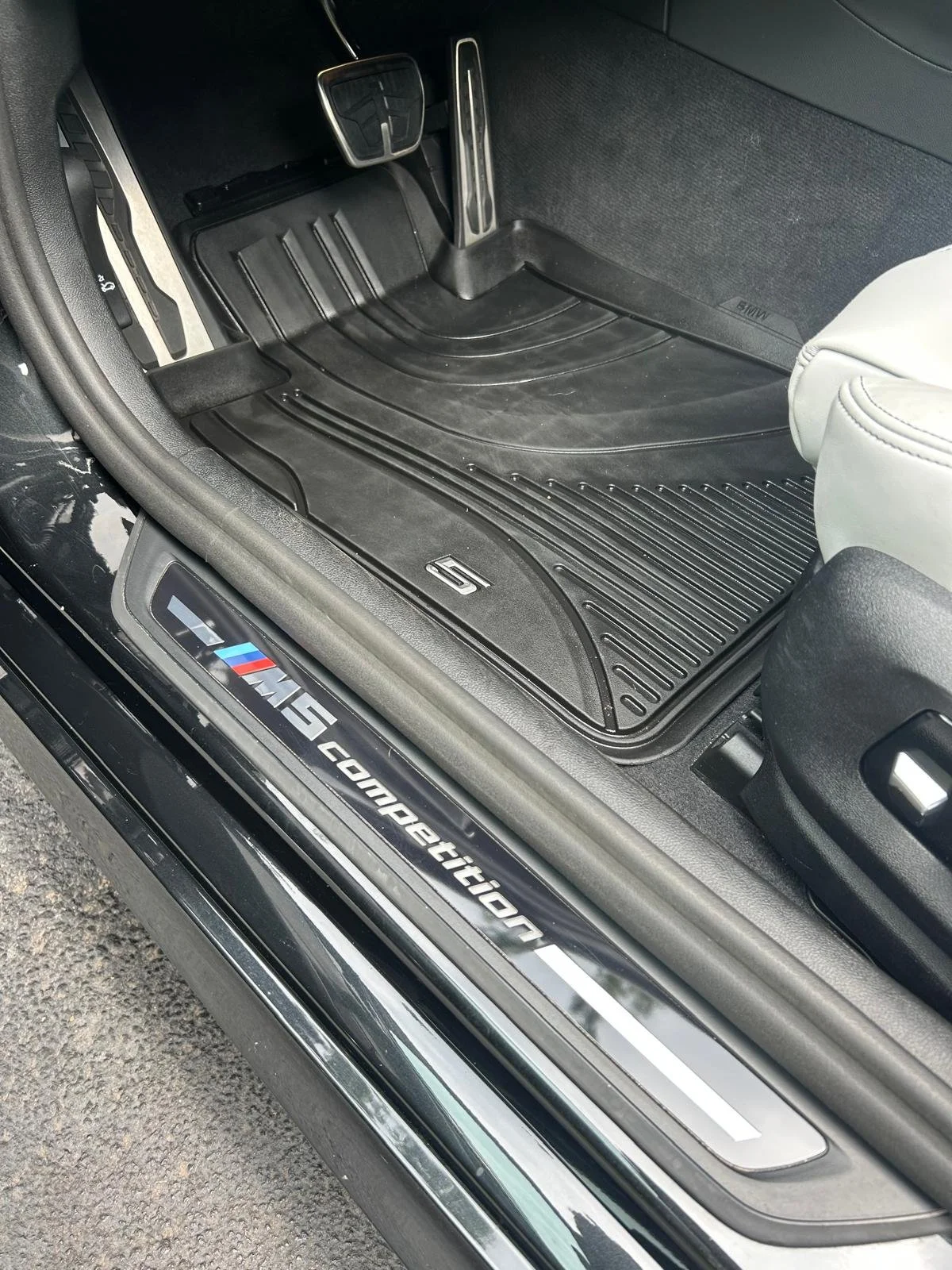 Close-up of the interior of a BMW M5 Competition car showing the floor mat with the 'M' logo and the door sill with 'M5 Competition' branding.