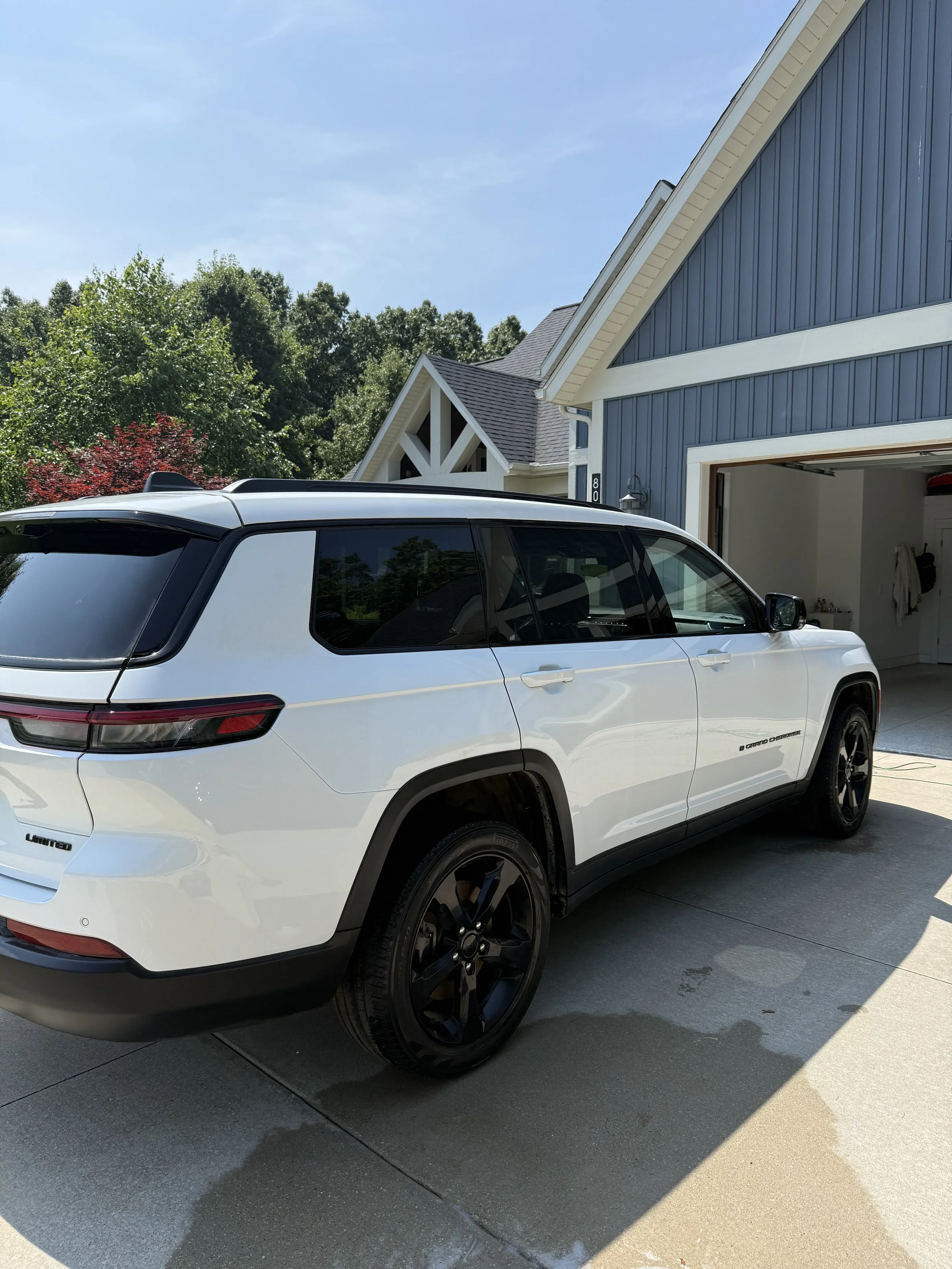 A white Jeep Grand Cherokee parked in a driveway outside a blue house with garage door open, surrounded by trees and a blue sky.