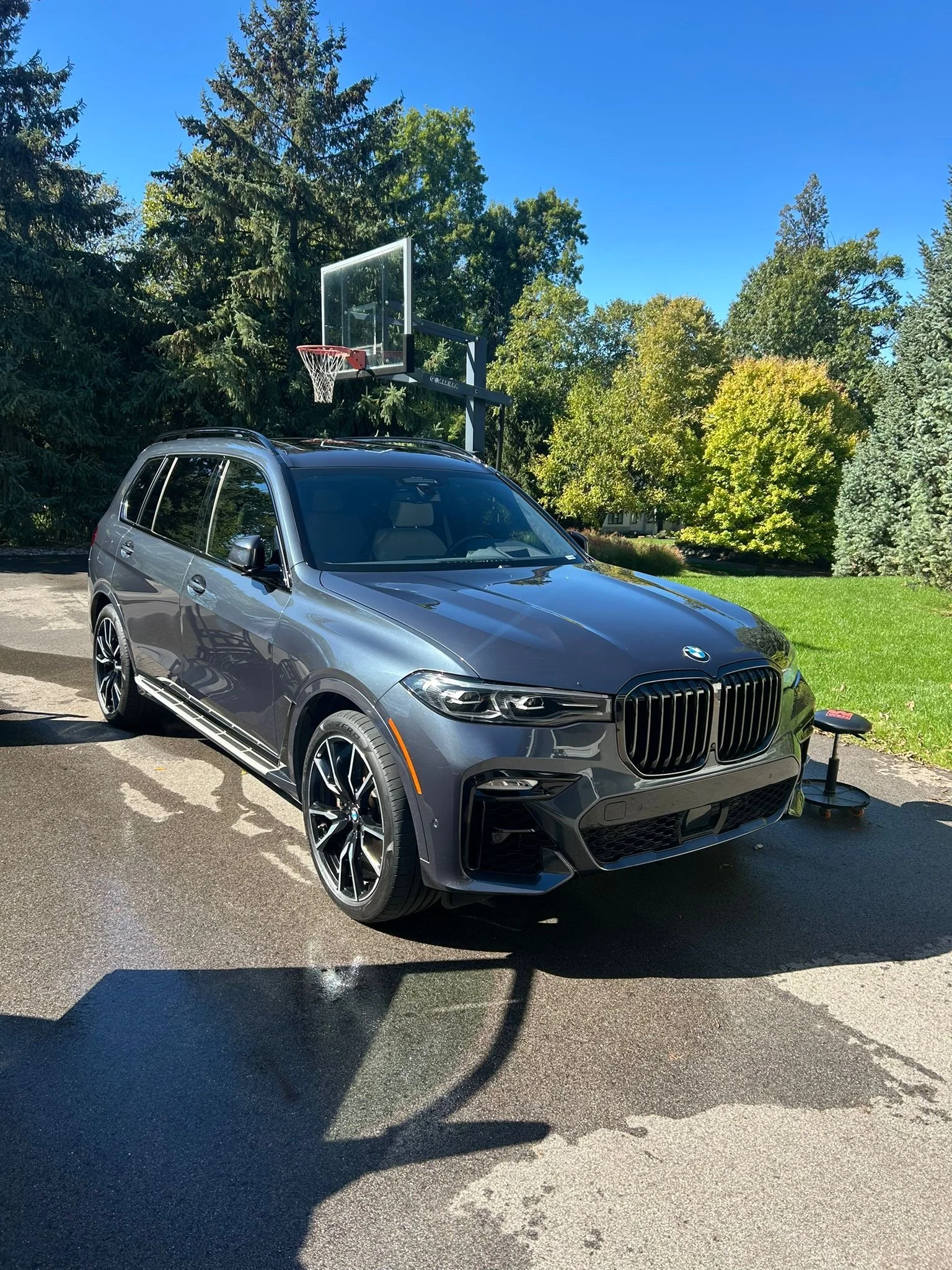 A gray BMW SUV parked on a driveway under a clear blue sky, with a basketball hoop and lush trees in the background.