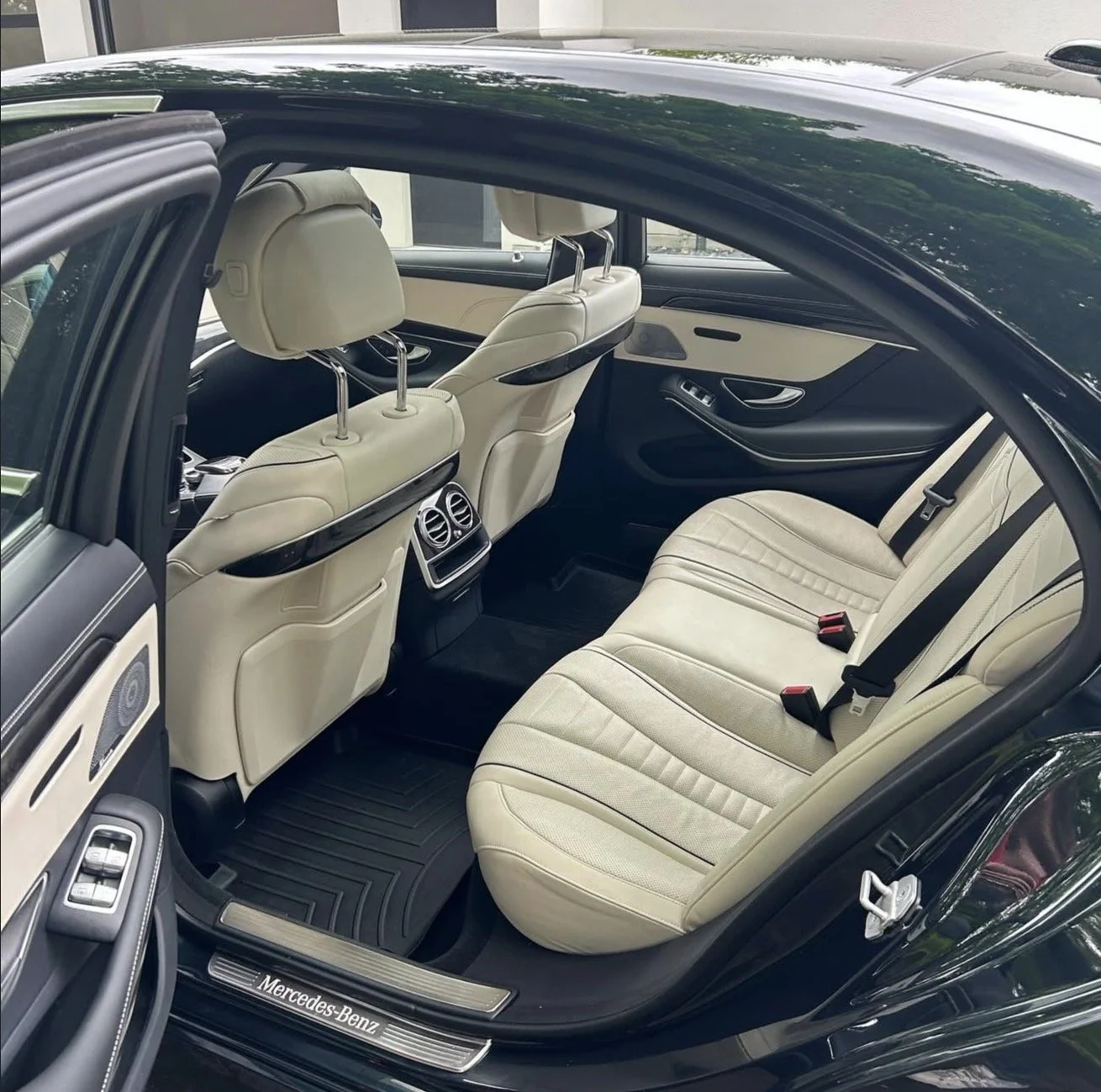 Interior of a black Mercedes-Benz with beige leather seats, front and rear, including headrests, air vents, and door panels.